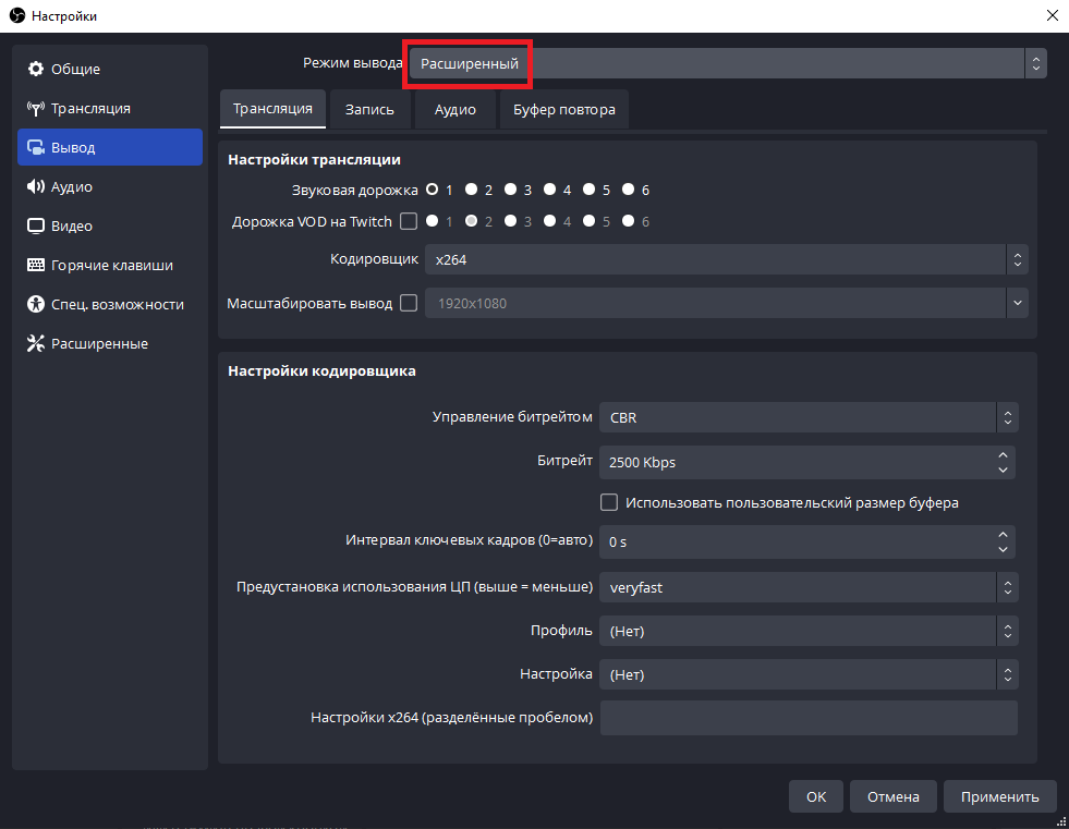 - Оптимальные настройки вывода (Output): Перейдите на вкладку «Вывод» и выберите «Расширенный» режим вывода.