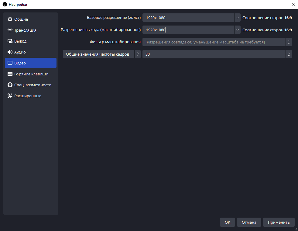 - Выходное (масштабированное) разрешение: Установите то разрешение, в котором вы планируете стримить (например, 1920x1080 или 1280x720).