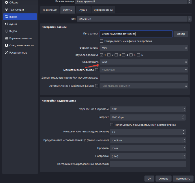 - Кодировщик: Если у вас современная видеокарта NVIDIA, выбирайте NVIDIA NVENC H.264 (new). Это позволит кодировать видео силами видеокарты, разгружая процессор. Для видеокарт AMD — AMD VCE/VCN H.264. В остальных случаях — x264.