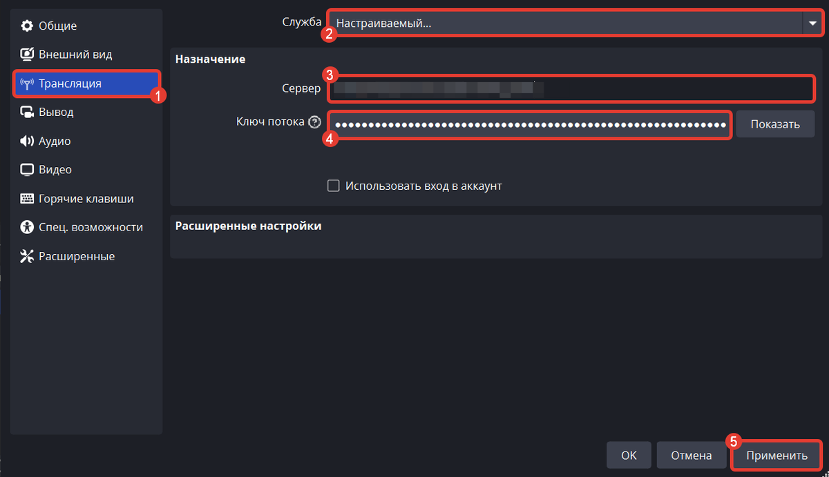 - Скопируйте URL сервера из ВК и вставьте его в поле «Сервер» в OBS.
