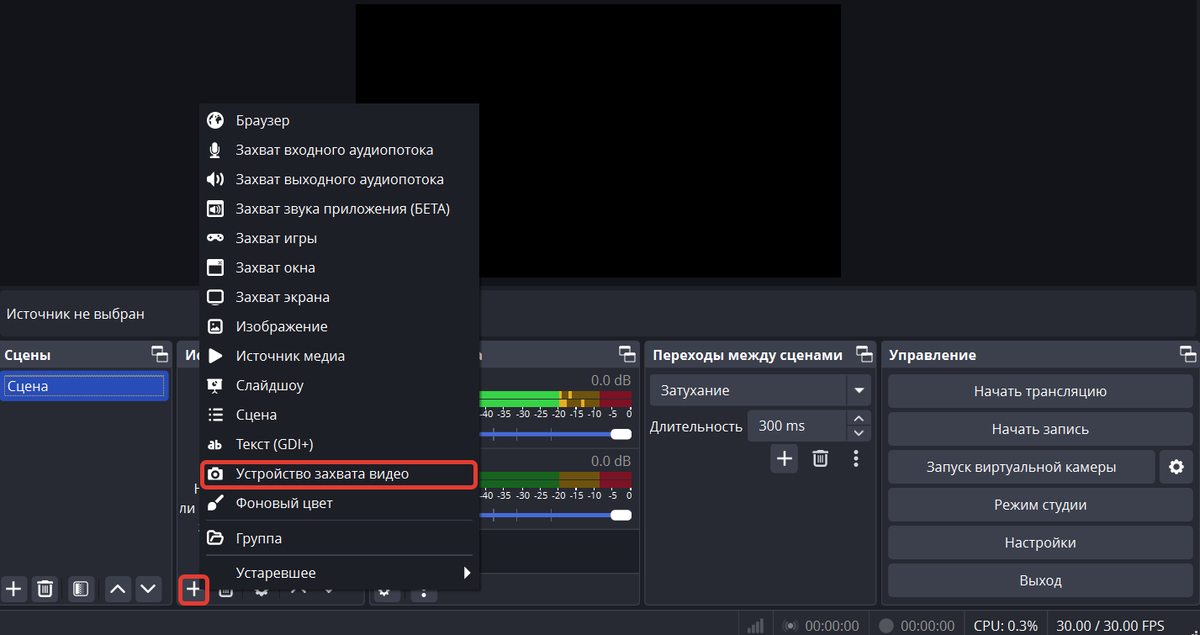 - В программе OBS: Настройте сцену (добавьте веб-камеру, захват экрана) и нажмите кнопку «Запустить трансляцию». Сигнал пойдет из вашего компьютера на серверы ВК.