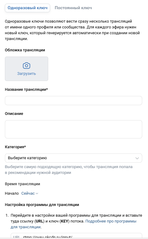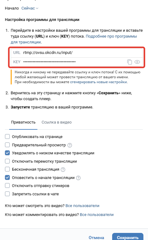 В окне настроек трансляции ВКонтакте вы увидите два ключевых поля: